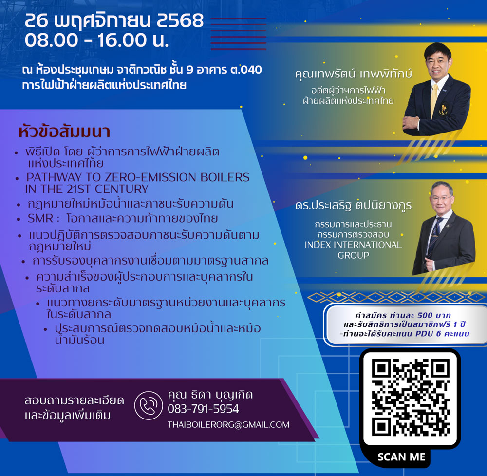 เตรียมพบกับงานสัมมนาครั้งสำคัญของปี สำหรับผู้เชี่ยวชาญและผู้ประกอบการในอุตสาหกรรมหม้อน้ำและภาชนะรับความดัน โดย สมาคมหม้อน้ำและภาชนะรับความดันไทย ร่วมกับ การไฟฟ้าฝ่ายผลิตแห่งประเทศไทย (กฟผ.) ปีนี้มาภายใต้แนวคิด “ยกระดับผู้ประกอบการและบุคคลากรด้านหม้อน้ำและอุปกรณ์รับความดันไทยสู่สากล” งานสัมมนาครั้งนี้จะรวบรวมผู้ผลิต วิศวกร ผู้ประกอบการ และผู้ให้บริการจากทั่วประเทศมาร่วมกันขับเคลื่อนการพัฒนาอุตสาหกรรมไทย สร้างโอกาสทางธุรกิจ รวมทั้งส่งเสริมอุตสาหกรรมที่เกี่ยวเนื่องในด้านหม้อน้ำและภาชนะรับความดัน ให้สามารถแข่งขันในระดับนานาชาติได้ จัดขึ้นวันที่ 26 พฤศจิกายน 2568 เวลา 08.00 น. – 16.00 น. ณ ห้องประชุมเกษม จาติกวณิช ชั้น 9 อาคาร ต.040 การไฟฟ้าฝ่ายผลิตแห่งประเทศไทย (กฟผ.)